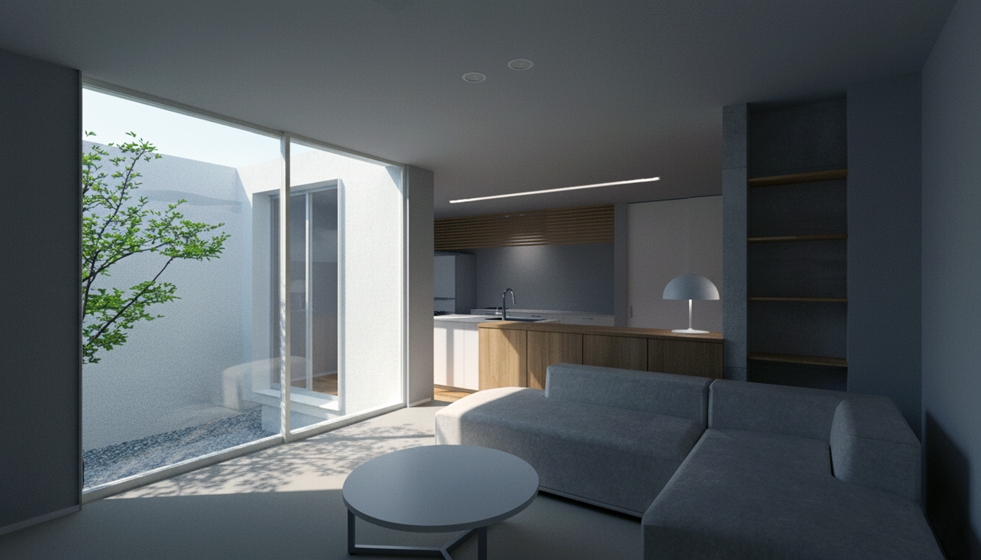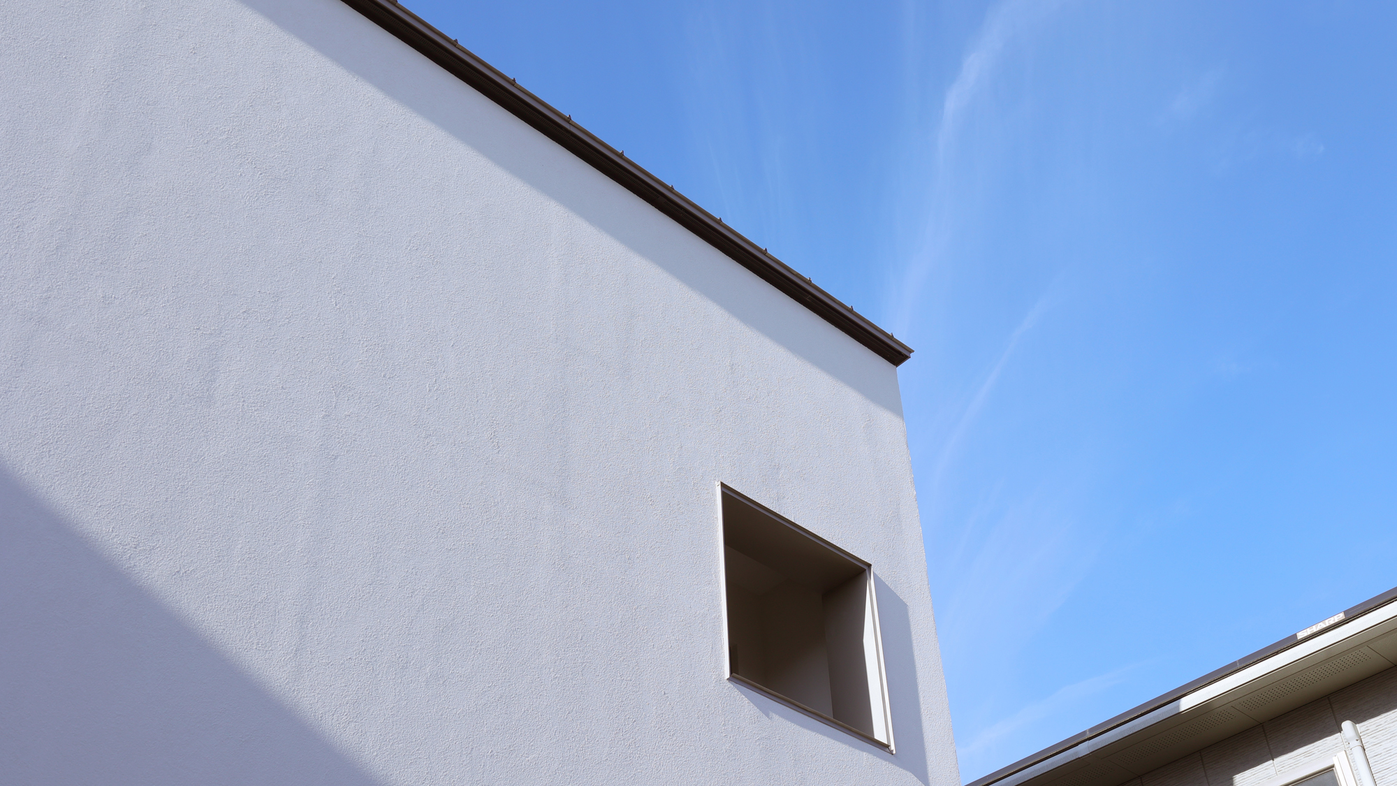 マットな質感の塗り壁が印象的な、シンプルな箱型の外観。外の喧騒から暮らしを守り、豊かな室内空間を静かに予感させ、街並みの中で、凛とした存在感を放ちます。