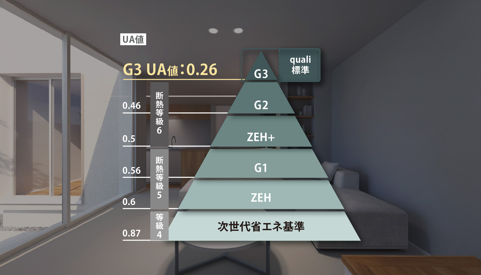 このモデルハウスの快適さは、qualiの標準仕様である「HEAT20 G3」の高性能によって実現されています。