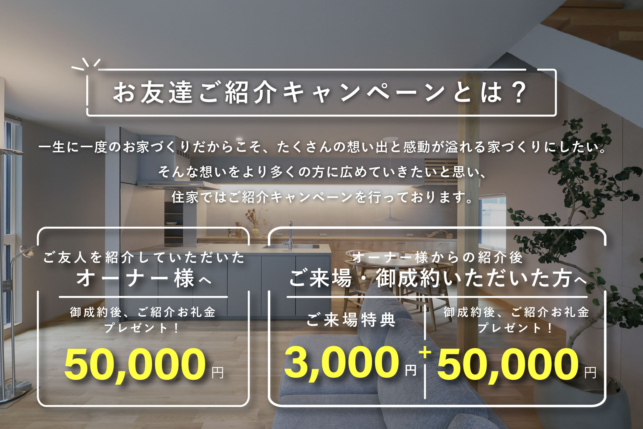 さらに、お友達がご成約となった場合には、ご紹介者様とお友達それぞれに ギフトカード50,000円分 をプレゼントいたします。