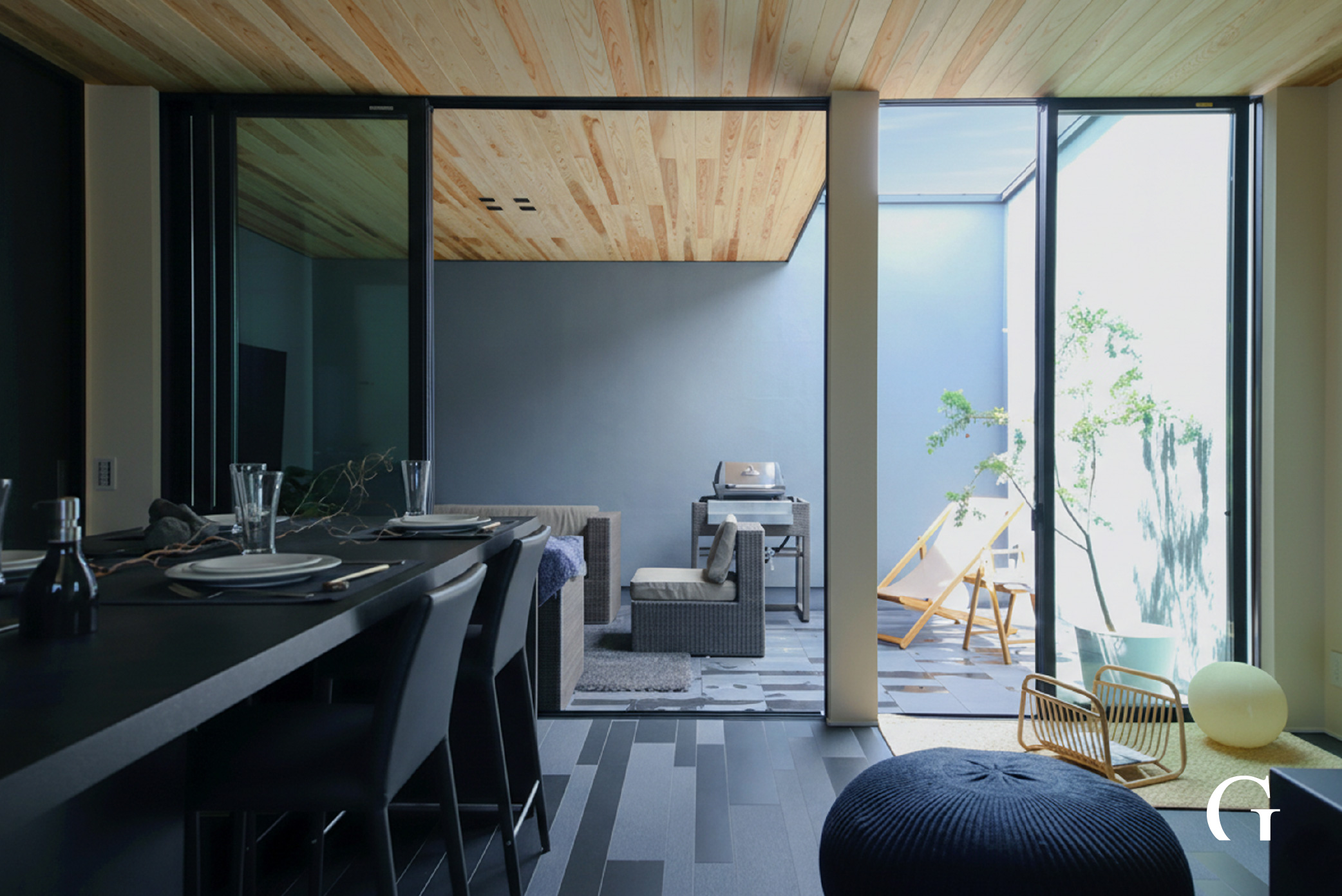 大きな窓を開け放てば、リビングはそのままアウトドア空間へ。