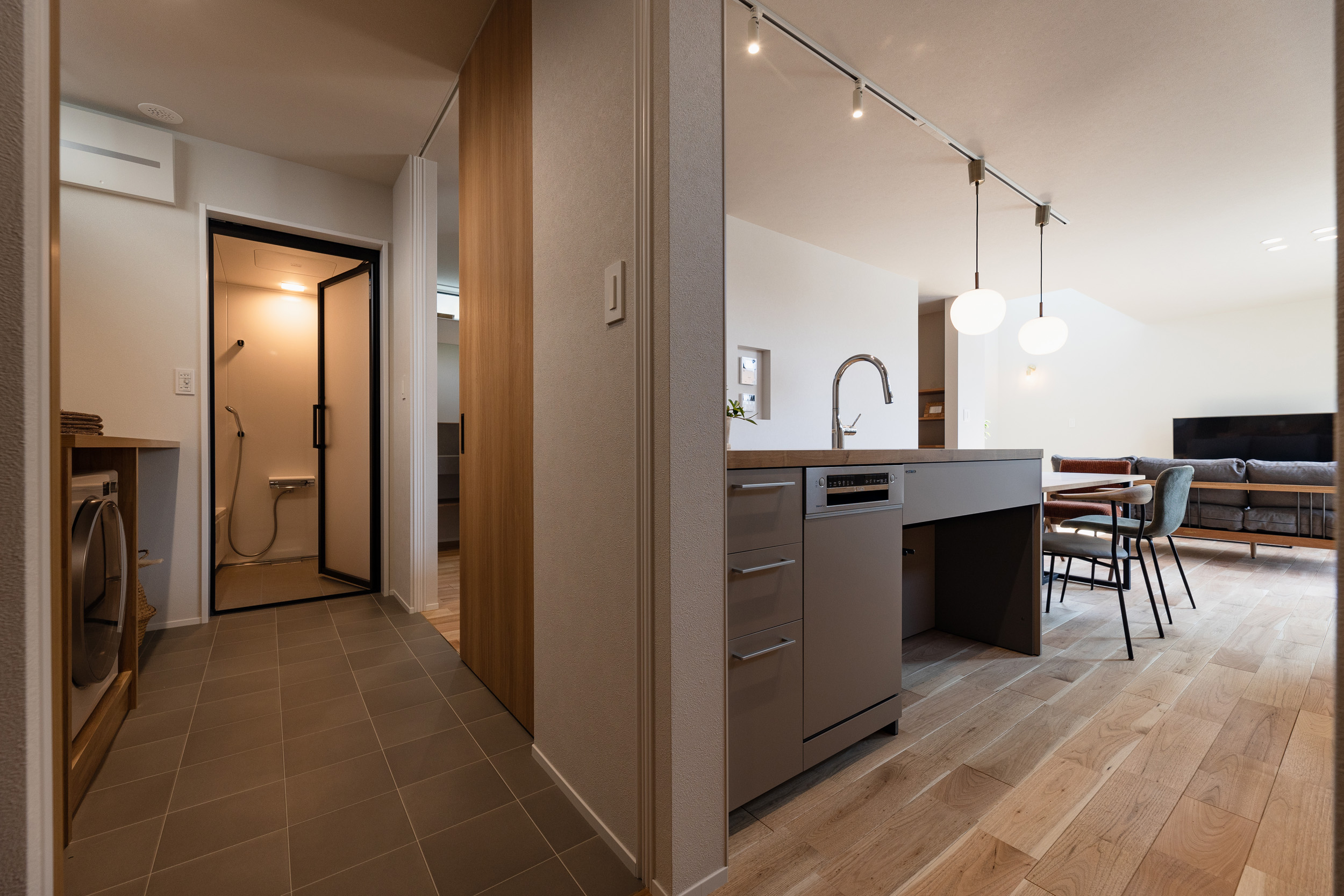 キッチン、洗面、脱衣室、クローゼットを繋げた行き止まりのない回遊動線。