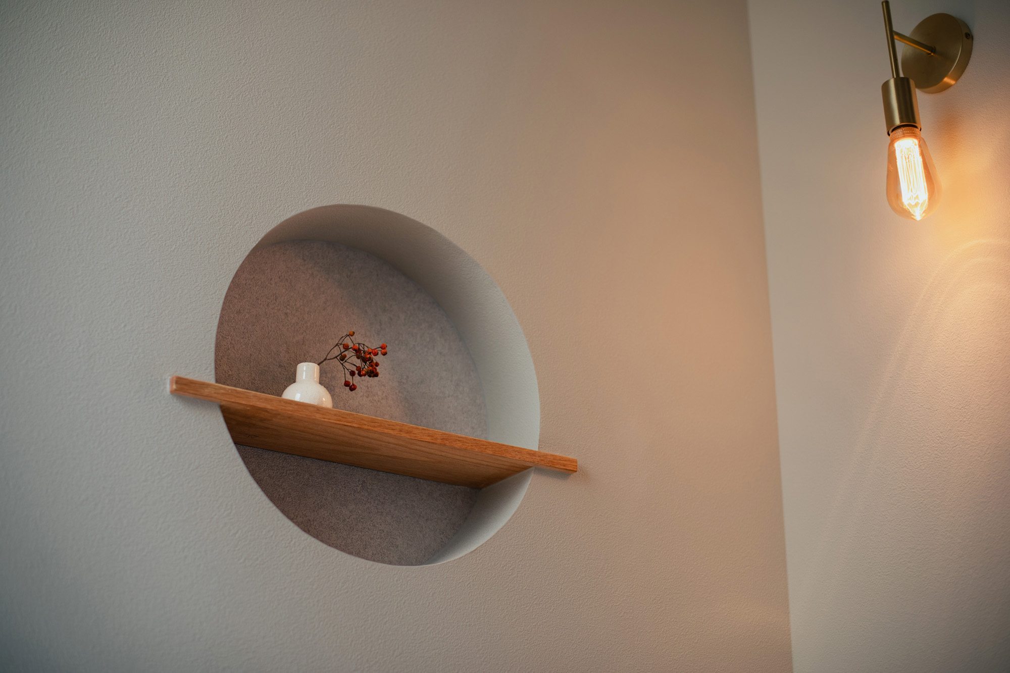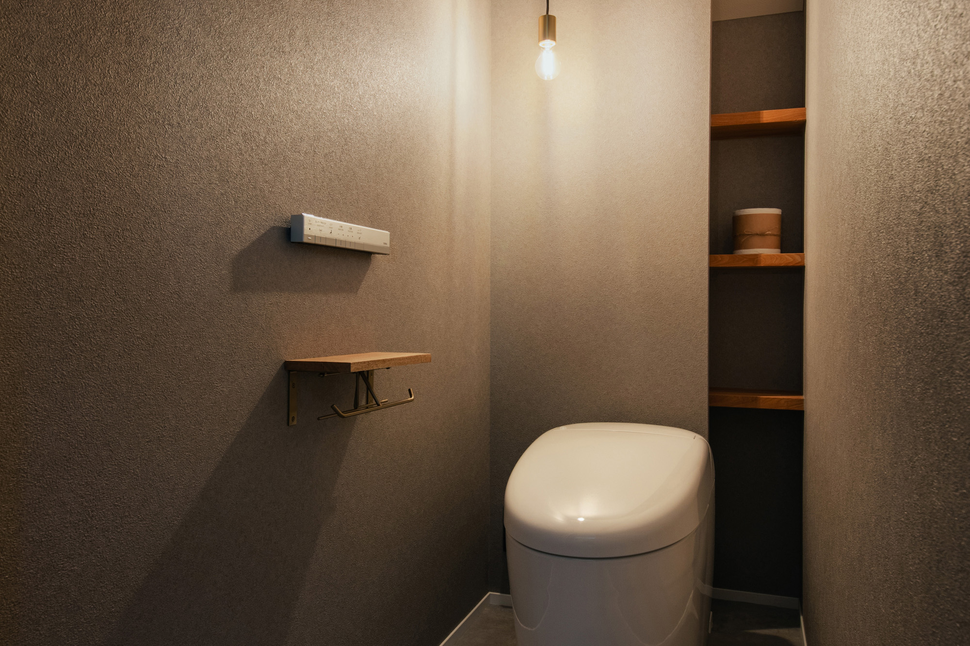 階段下のトイレ。背面には壁の中に伸びる小さな収納スペースを取り入れて、日用品などをすっきり収納できます。