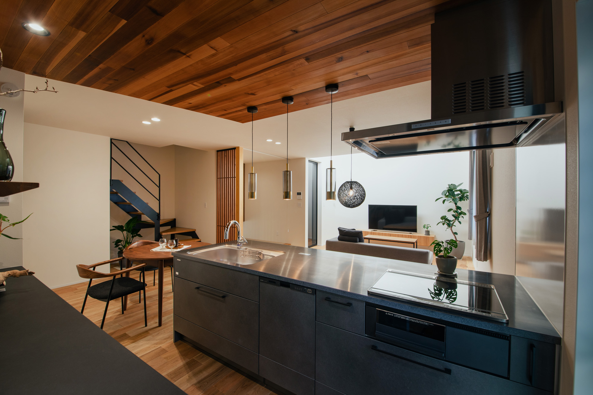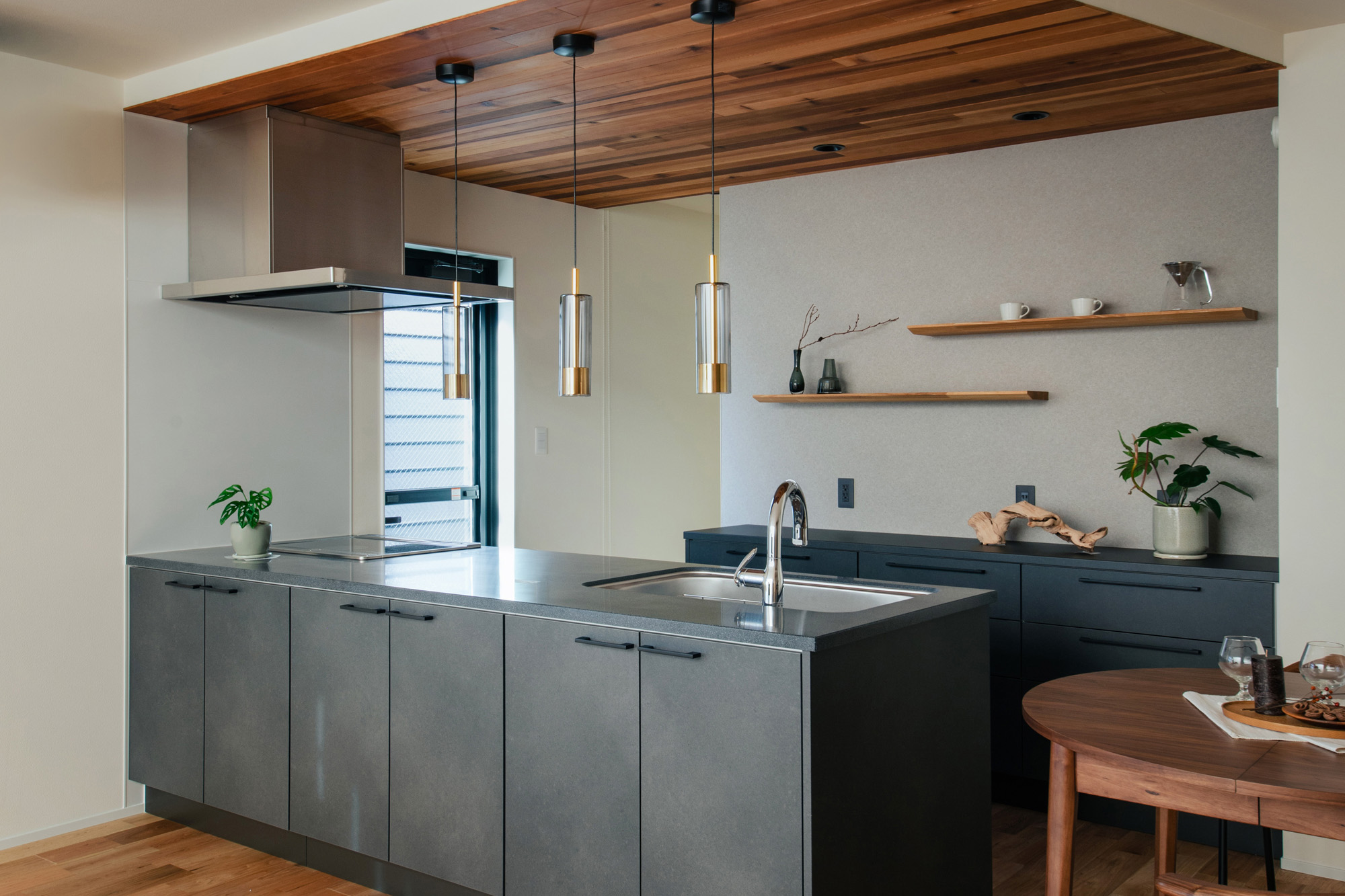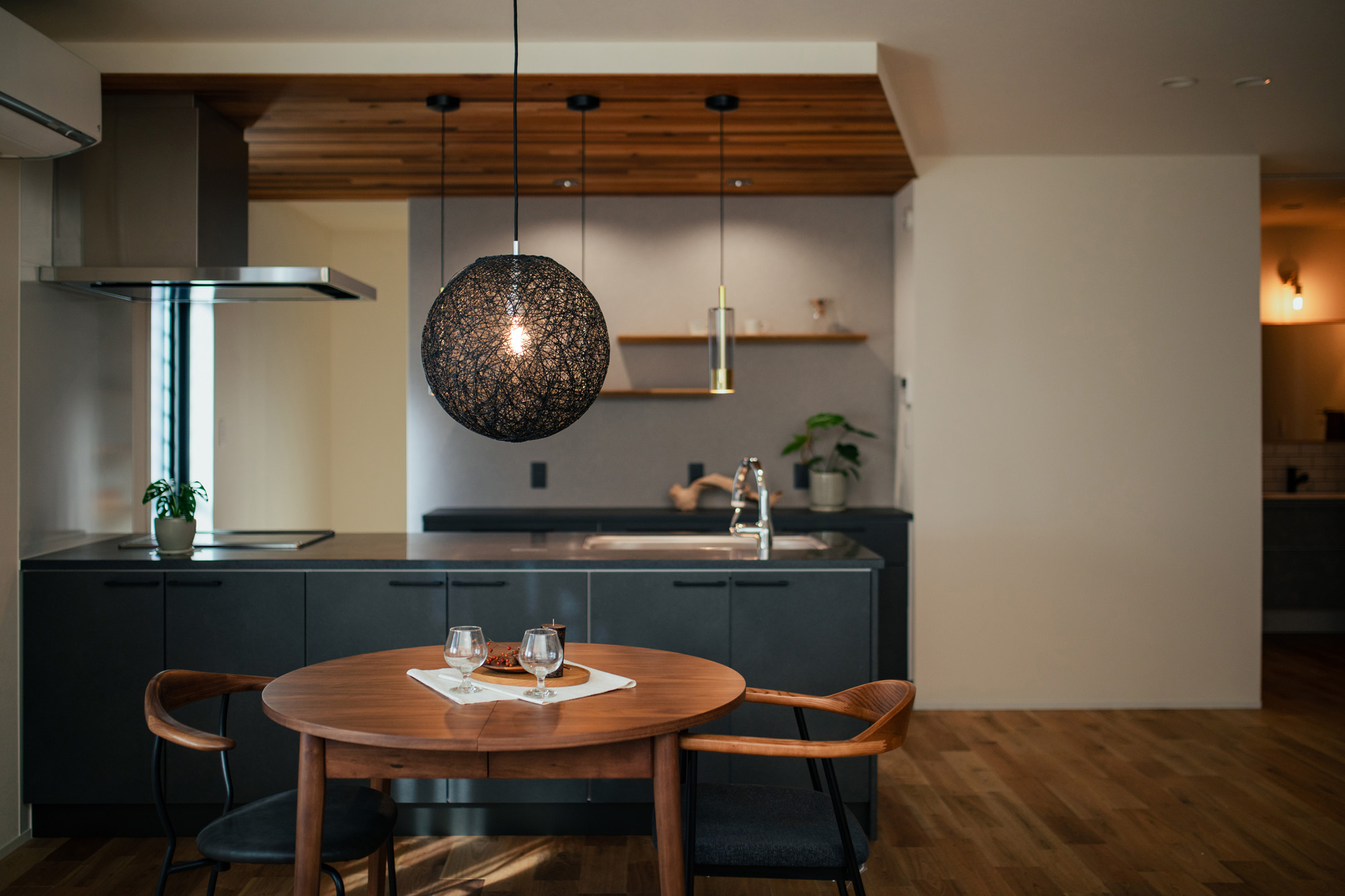 照明と素材感を丁寧に整えた、心落ち着くダイニングキッチン。使いやすくて絵になる空間です。