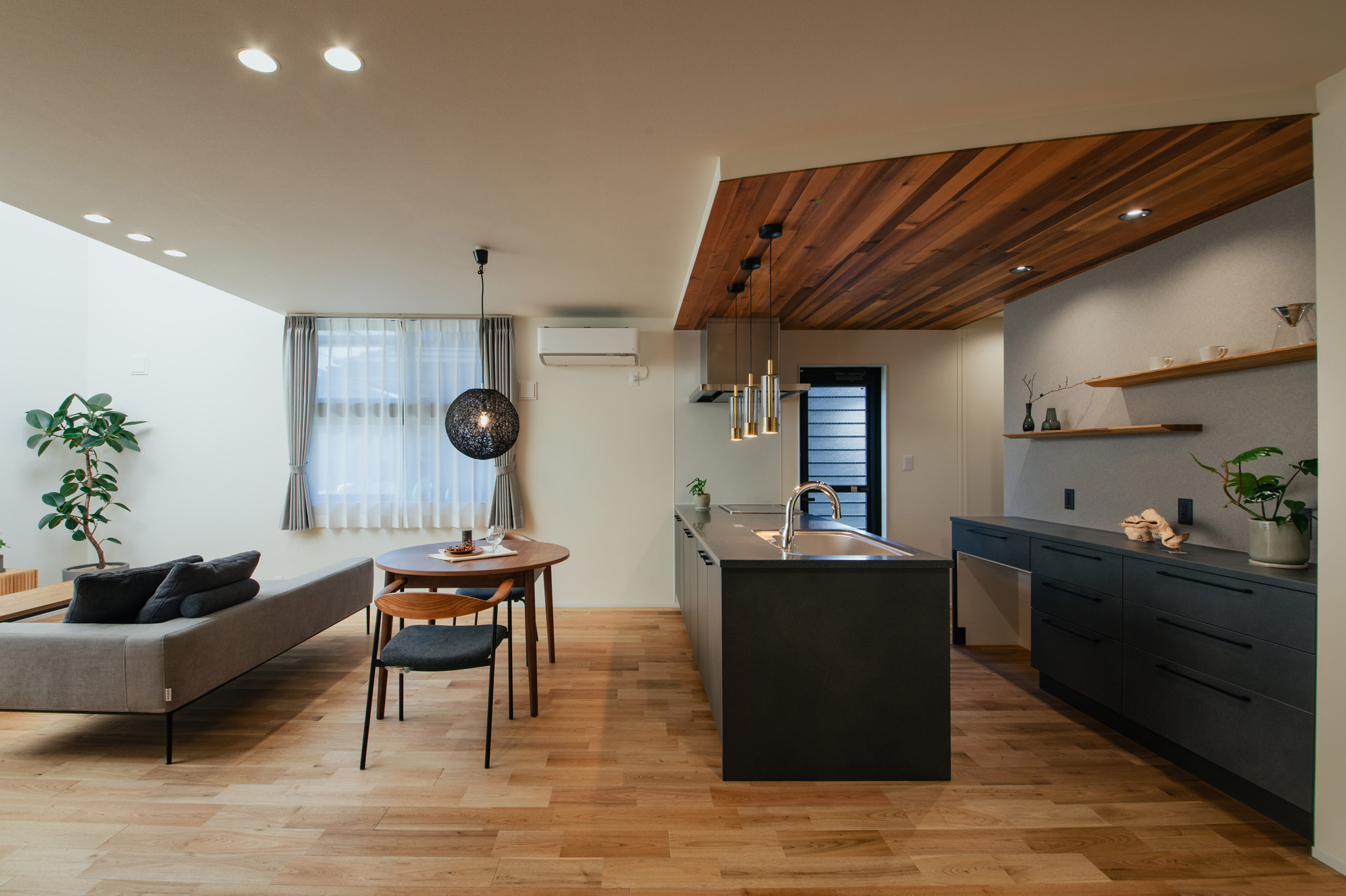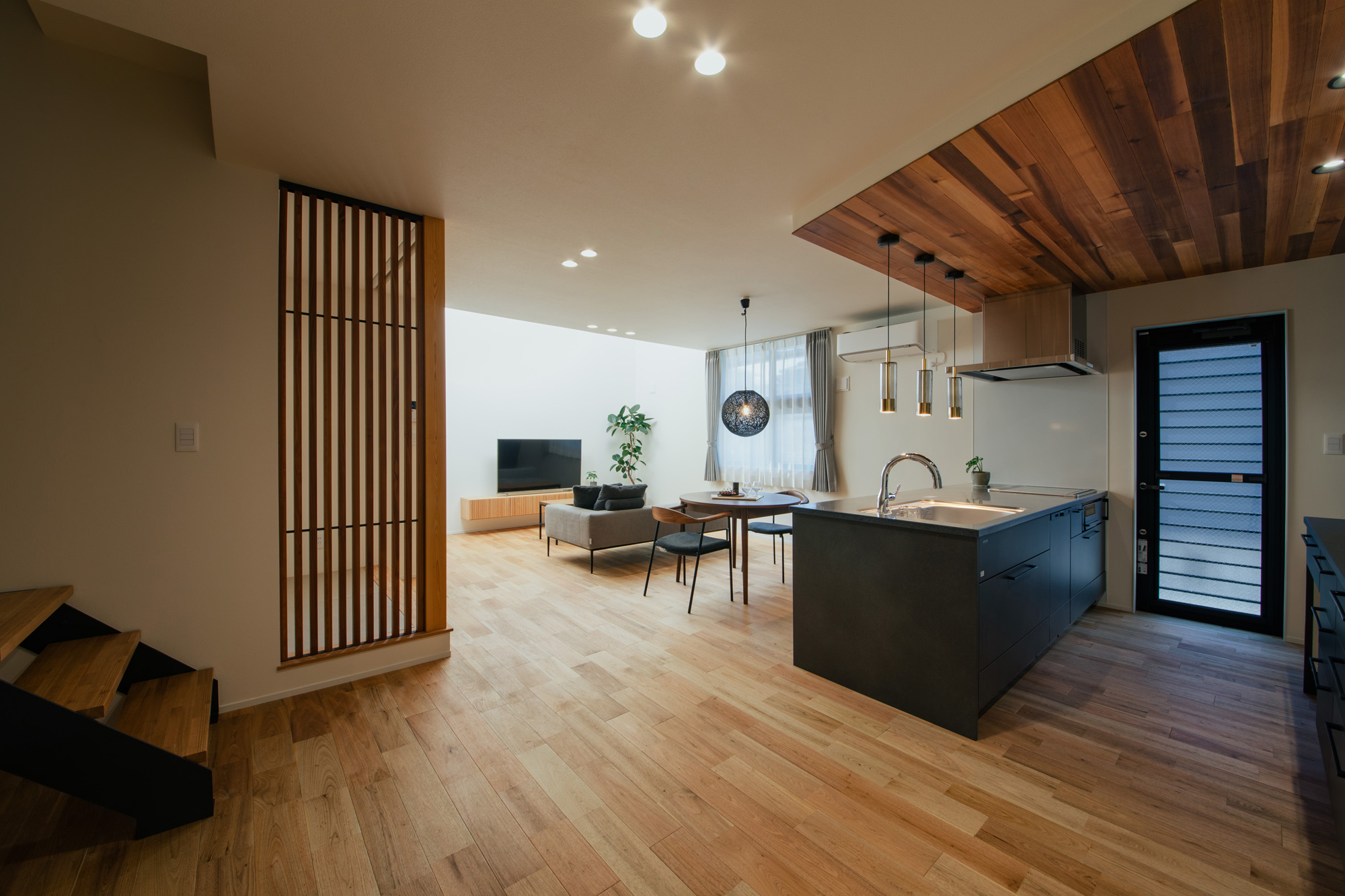 経年変化を感じられる木の質感と、和の要素が調和し落ち着きを感じられるLDK。
